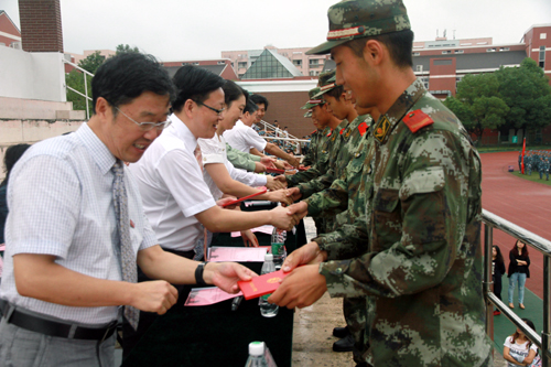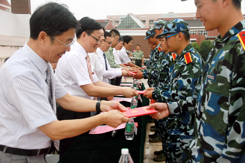 军训汇报表演后,赵凯雷副院长宣读了《关于表彰2014级新生军训标兵、优秀学员的决定》,主席台上的领导分别为军训优秀学员代表、军训标兵代表以及军训优秀教官颁发荣誉证书。