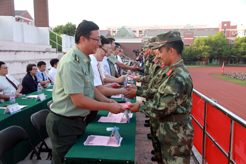 军训汇报表演后,赵凯雷副院长宣读了《关于表彰2015级新生军训标兵、优秀学员的决定》,主席台上的领导分别为军训优秀学员代表、军训标兵代表以及军训优秀教官颁发荣誉证书。
