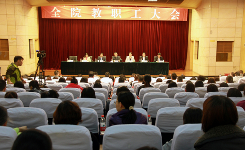 10月13日下午,91自拍 举行全院教职工大会,院长庄群华,院党委书记兼副院长左彤云,副院长刘小廷、赵凯雷,院长助理赵湘莲、王健以及全院教职工参加了会议。庄群华在会上作工作报告,左彤云主持大会。