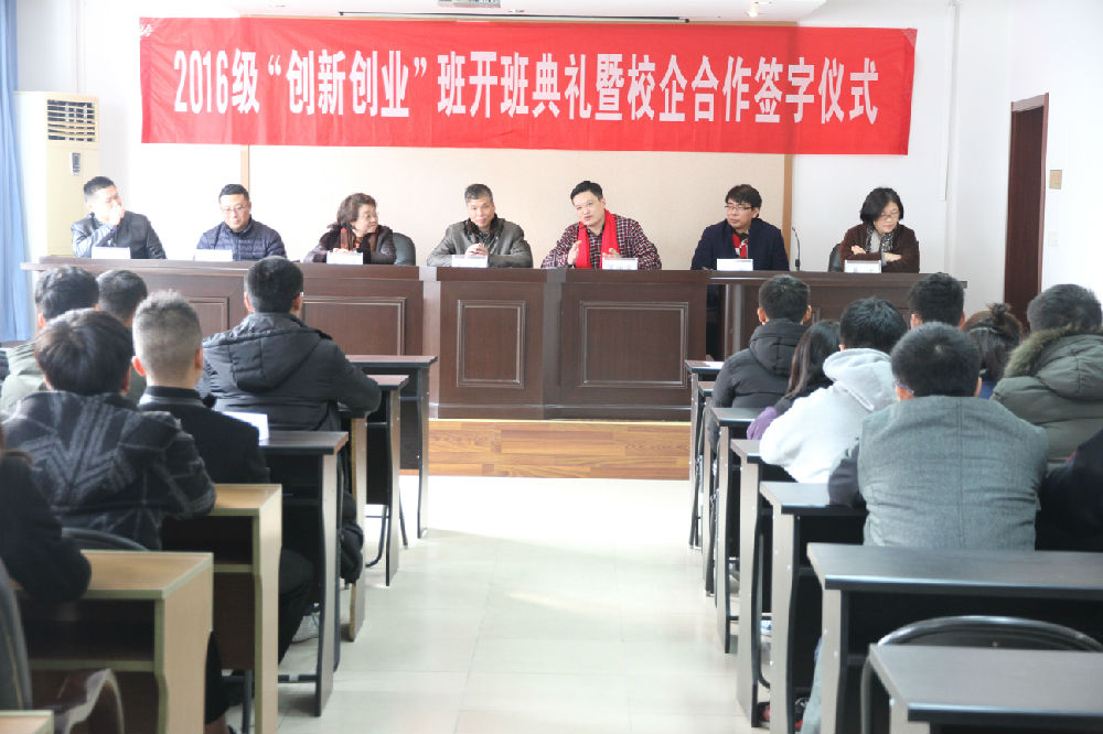 12月28日下午,经济与管理系召开2016级创新创业班开班典礼。副院长刘小廷、校企合作单位南京博峻集团董事长屈伯俊先生、总经理王翔先生、91自拍 教务处处长吕立志、学生处处长姚强、经济与管理系领导共同参加了开班典礼。