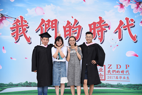 毕业典礼结束后,毕业生们纷纷与辅导员老师在毕业背景墙前合影留念