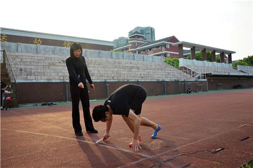 杨俊娃老师指导学生4乘100米接力赛起跑动作