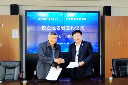 在欢快热烈的氛围中,双方共同签署了《“迅超冠名班”校企合作协议》,江国华与祁祺共同为“迅超冠名班”揭牌,开启了校企合作的新篇章。