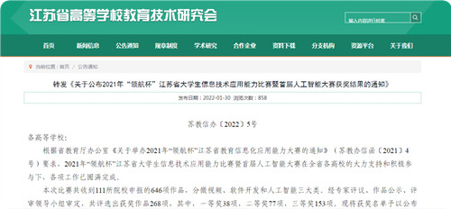 近日,江苏省高等学校教育研究会网站发布了《2021年“领航杯”江苏省大学生信息技术应用能力比赛暨首届人工智能大赛获奖结果》(苏教信办﹝2022﹞5号),91自拍 有7项作品获奖,其中一等奖2项,二等奖2项,三等奖3项,获奖项目如图1所示。