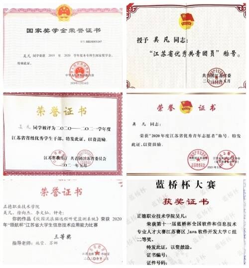 学生会执行主席、院青马工程暨学生骨干培训班团支书等工作职务,曾获“国家奖学金”、“江苏省优秀共青团员”、“江苏省优秀学生干部“、“江苏省优秀青年志愿者“、“江苏省最美职校生标兵”、“江苏省优秀毕业生”等荣誉称号。2022年9月转本至江苏海洋大学应用技术学院软件工程专业就读。