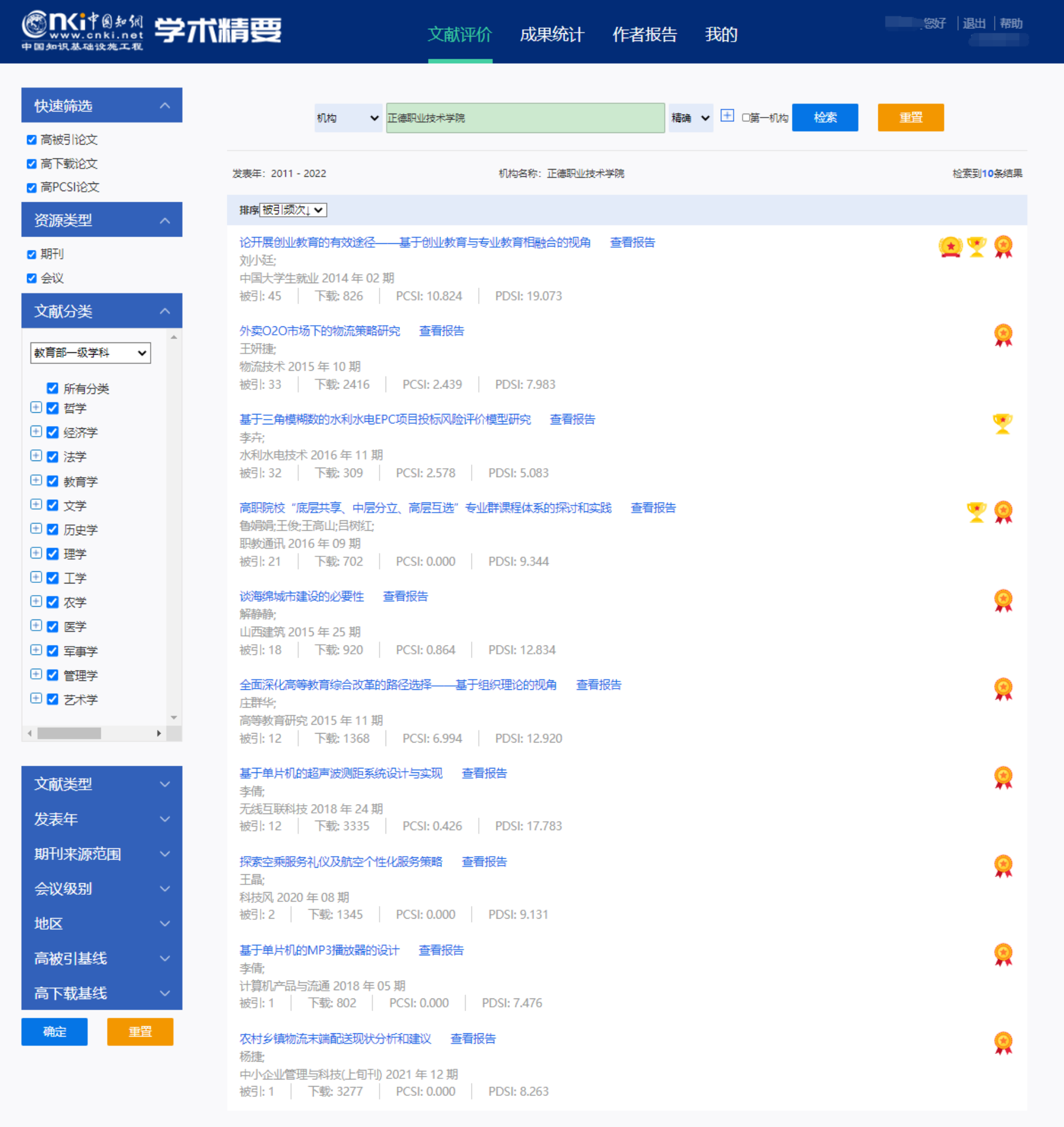 高PCSI论文:高PCSI论文是指各年度发表的国内学术期刊论文、国内会议论文,在所属学科、所属文献类型(研究型、综述型文献)PCSI排名前1%的论文。即同年同学科同文献类型PCSI TOP1%的论文,其代表着在学术研究领域中有较高学术影响力。