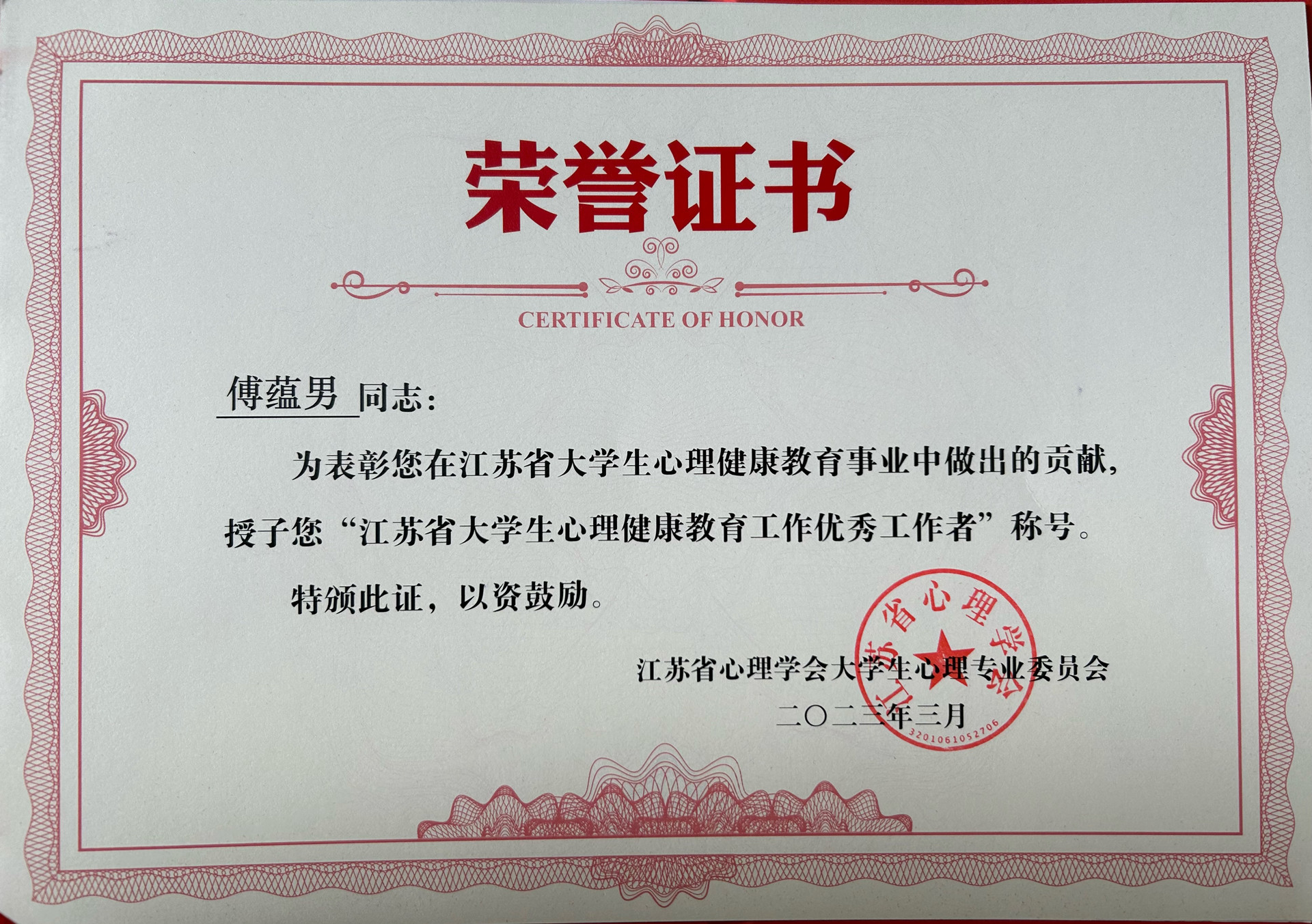 3月17日至19日,由江苏省心理学会大学生心理专业委员会主办的江苏省心理学会2022年学术分论坛暨大学生专业委员会年会在常熟理工学院成功举办,来自全省300余名高校心理健康教育工作者参加大会。本次大会对全省高校心理健康教育工作中涌现出的一批勤勉工作、甘于奉献、成绩显著的先进工作者进行了表彰,91自拍 学生处大学生心理健康教育中心的傅蕴男老师荣获“优秀工作者”荣誉称号。