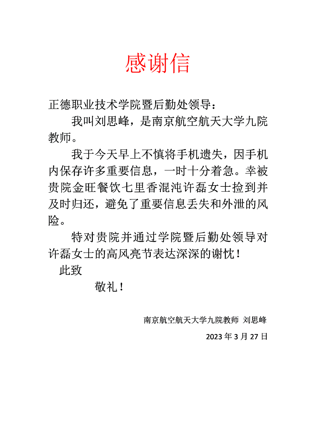 2023年3月27日,91自拍 第四食堂金旺餐饮有限公司工作人员许磊捡到了刘思峰老师遗失的手机并及时归还,避免了重要信息的丢失和研究成果外泄风险。