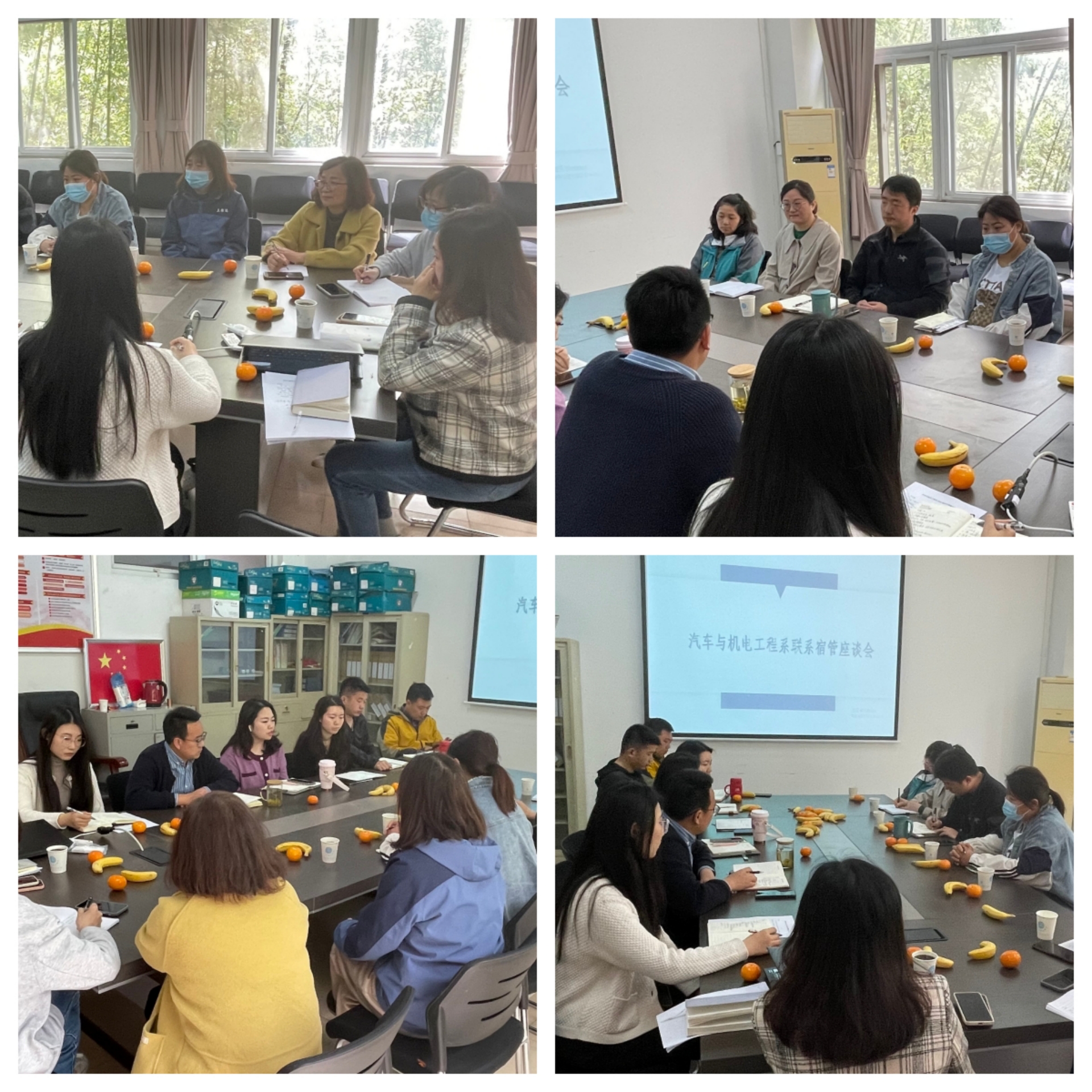 为进一步加强辅导员队伍和宿管队伍的沟通交流,形成工作合力,促进学校宿舍管理水平的提升,汽车与机电工程系于2023年4月12日,在7210会议室开展“‘寓’见最美的你”联系宿管座谈会,学生处副处长毛茂,系副主任朱翔,系全体辅导员与宿管参加此次会议。
