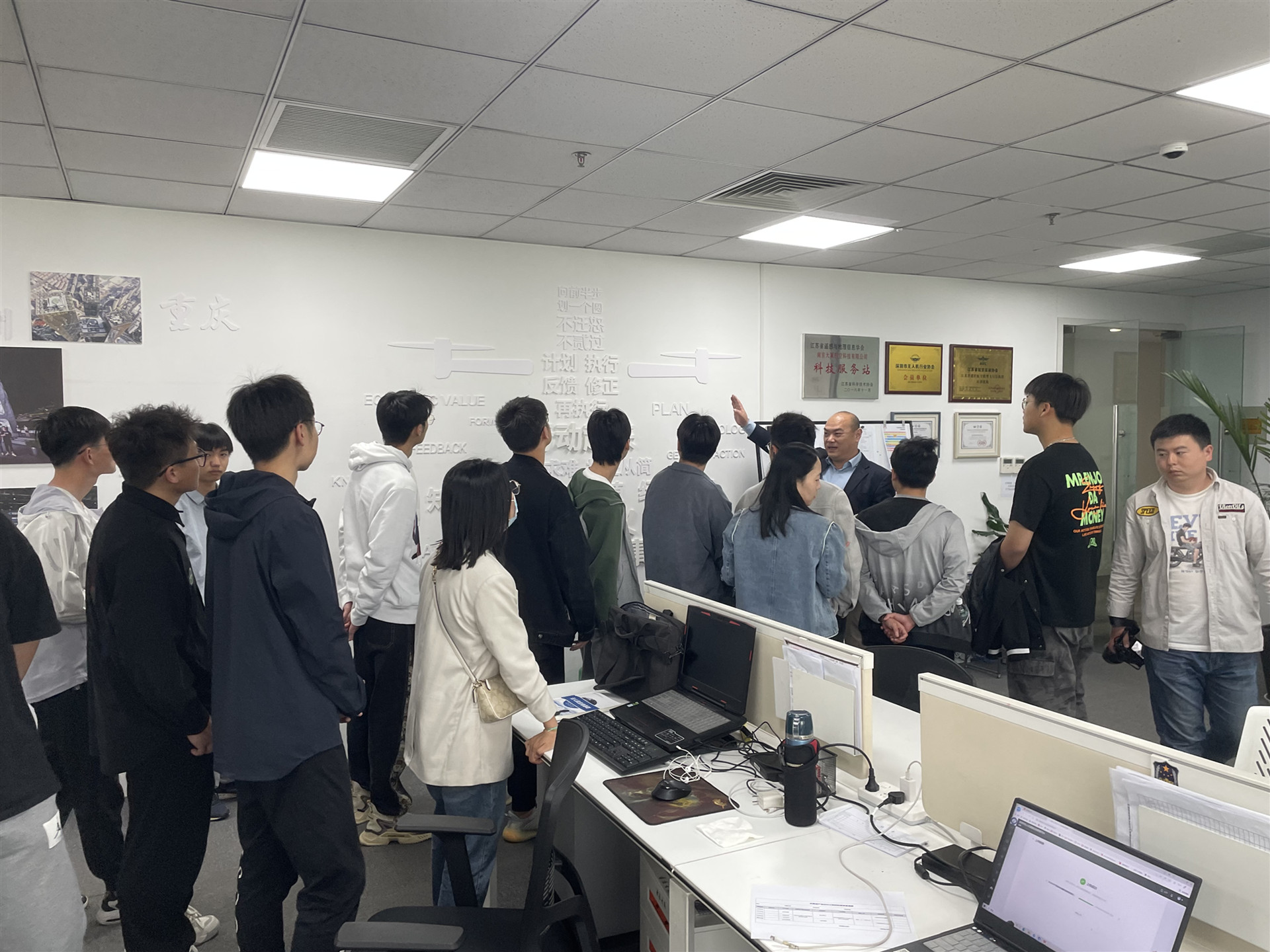 为深入学习贯彻习近平总书记关于新时代人才工作的重要思想,使大学生尽快成长成才,快速融入企业发展中来。电子与信息技术系无人机应用技术专业2021级38名同学在徐宏庆、李倩、王丹、孙军辉四位老师的带领下于4月12日下午赴南京大翼航空科技有限公司,开展了一次无人机专业岗位认知学习实践活动。