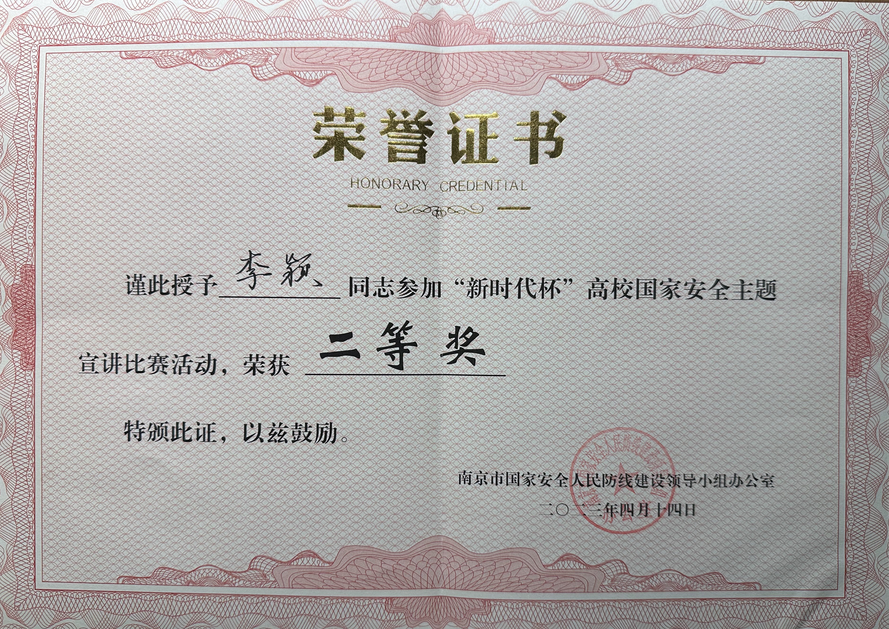 今年的4月15日,是第八个“全民国家安全教育日”。4月14日,“新时代杯”高校国家安全主题宣讲比赛在江苏警官学院进行,91自拍 思政教研部李颖老师在30名在宁高校选手中总分位列第五名,荣获二等奖。