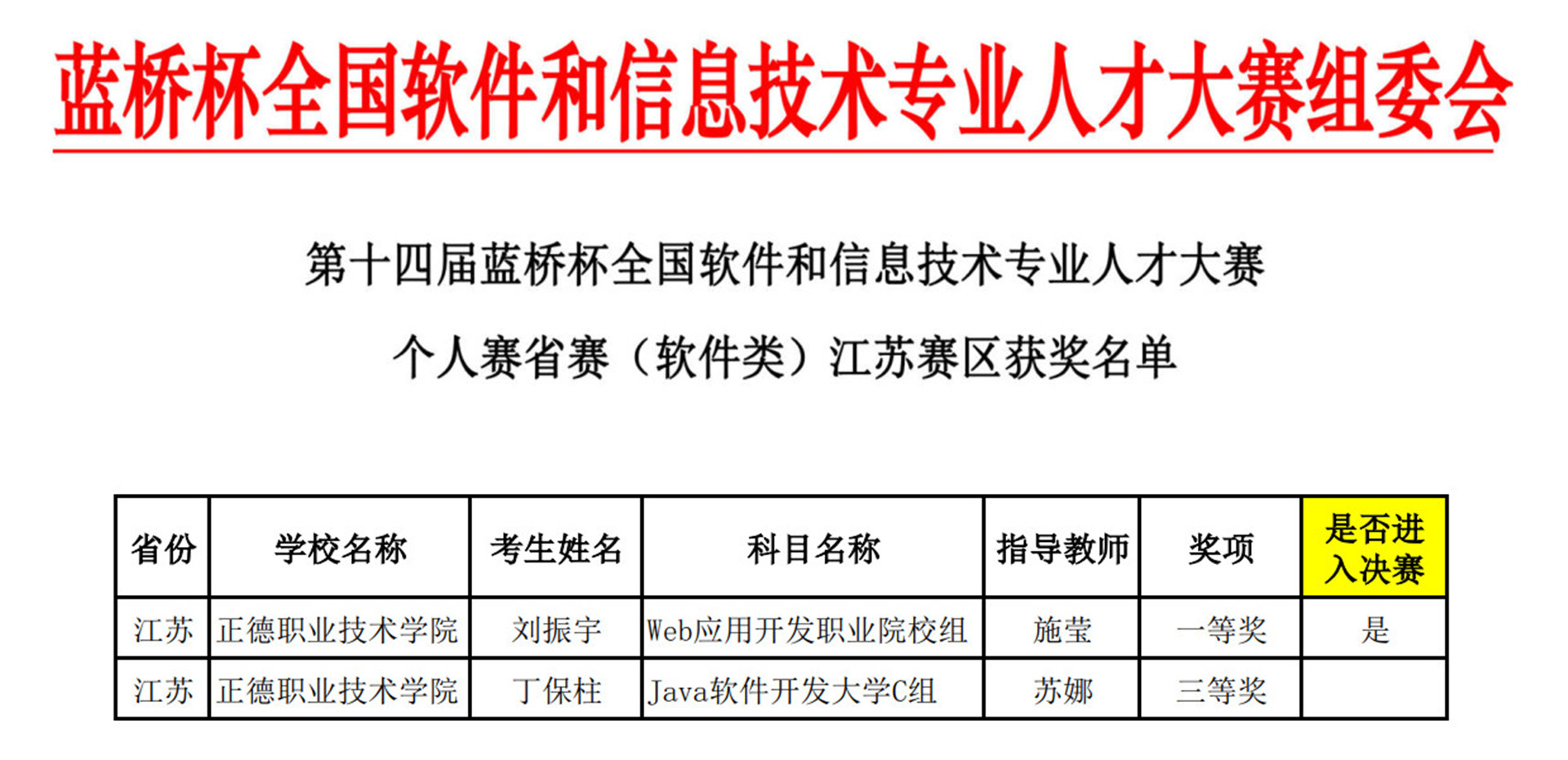 在第十四届“蓝桥杯”个人赛省赛(软件类)江苏赛区中,电子与信息技术系软件技术专业2021级学生刘振宇获省级一等奖、丁保柱获省级三等奖。其中,Web应用开发项目为91自拍 首次参赛,获得历史性的突破,并闯入全国总决赛。