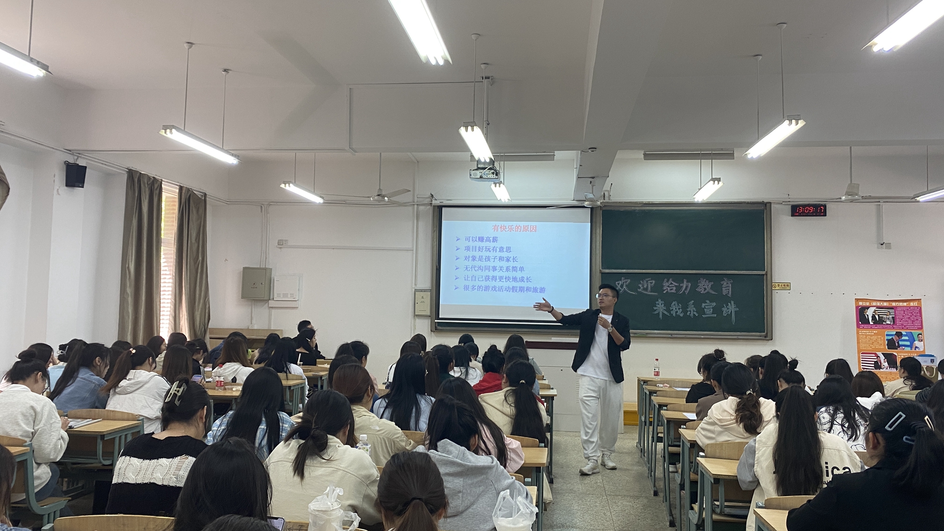 2023年4月23日,基础教育系邀请校南京给力艺术培训有限公司走进校园,在9108教室进行企业宣讲。2021级婴幼儿托育服务与管理专业全体学生参加,此次宣讲会给予即将面临实习的学子们一个近距离了解企业的机会。