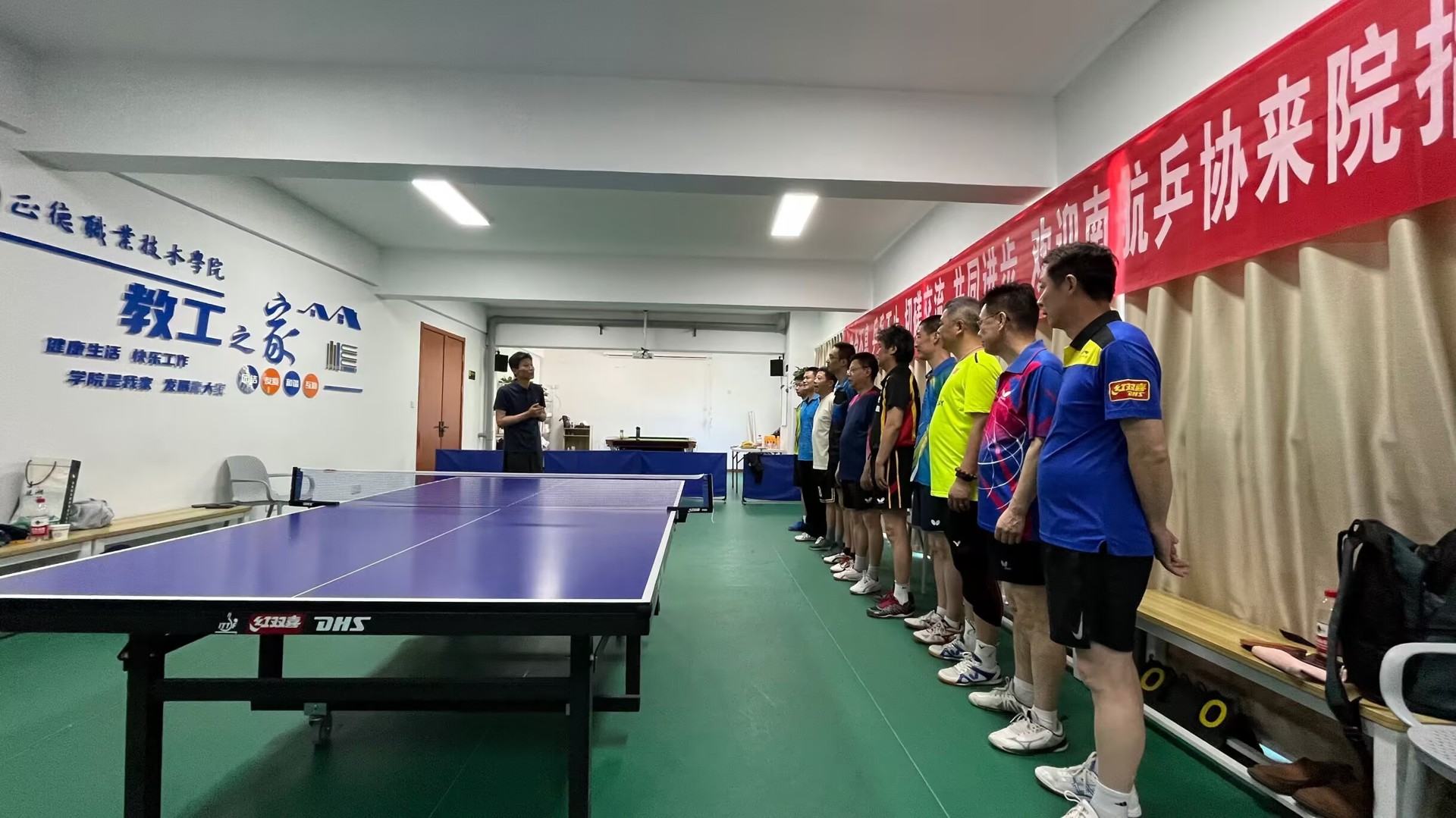 院长助理、院工会副主席王健代表学院工会出席交流活动。他对南航乒协来院交流表示热烈的欢迎,预祝双方参赛选手通过相互交流、相互切磋,共同提高乒乓球水平,也为两校文体活动的深度交流添砖加瓦。