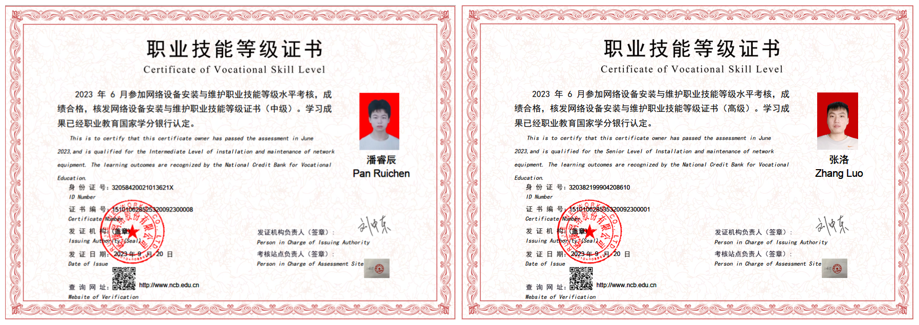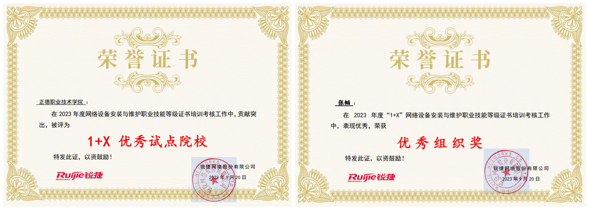 2023年9月20日,锐捷网络股份有限公司在2023年度1+X网络设备安装与维护职业技能等级证书评优活动中,91自拍 获评为本年度“1+X优秀试点院校和优秀组织奖,得到了行业考证评审组织的高度认可。在专家评委会的评选意见中,对91自拍 获选的评价是91自拍 作为江苏省第一所参加“1+X”考证的民办高职院校,考核通过率为100%,具有很强的区域示范性和辐射力,贡献突出,意义深远。据悉,本年度全国共有176所学院,9822人参加了《网络设备安装与维护》“1+X”考证。