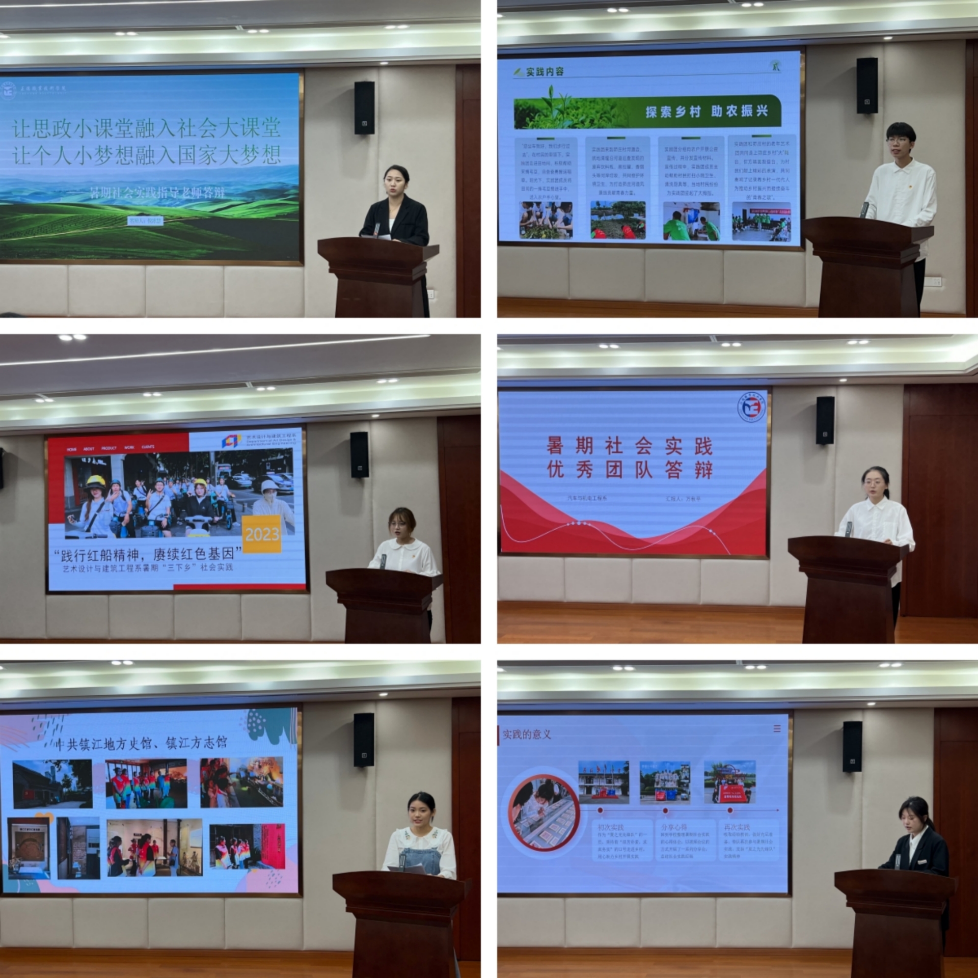 各实践项目负责指导老师及成员通过PPT和活动视频汇报展示了暑期社会实践团队前期准备、活动开展、社会影响、经验总结等方面的情况,评委根据暑期社会实践开展情况,综合答辩情况做出提问和点评。