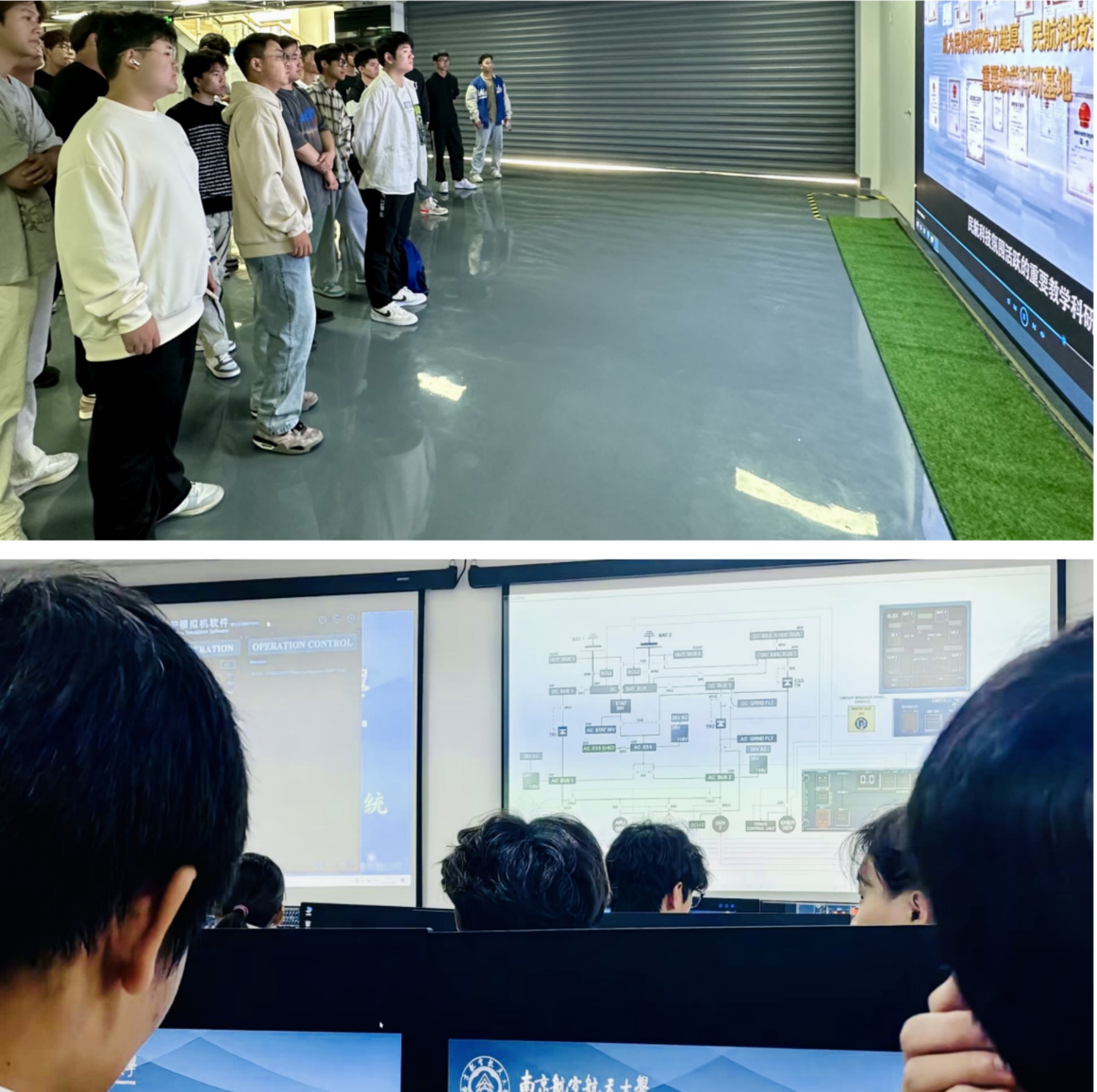 同学们首先参观了南航大民航学院飞机维修相关专业的A320/B737飞机维修虚拟仿真国家级实训室、民航飞机健康监测与智能维护重点实验室、民航应急科学与技术重点实验室、民航机务维修工程科研基地。同学们在参观过程中对这些高水平的实验条件赞叹不已。