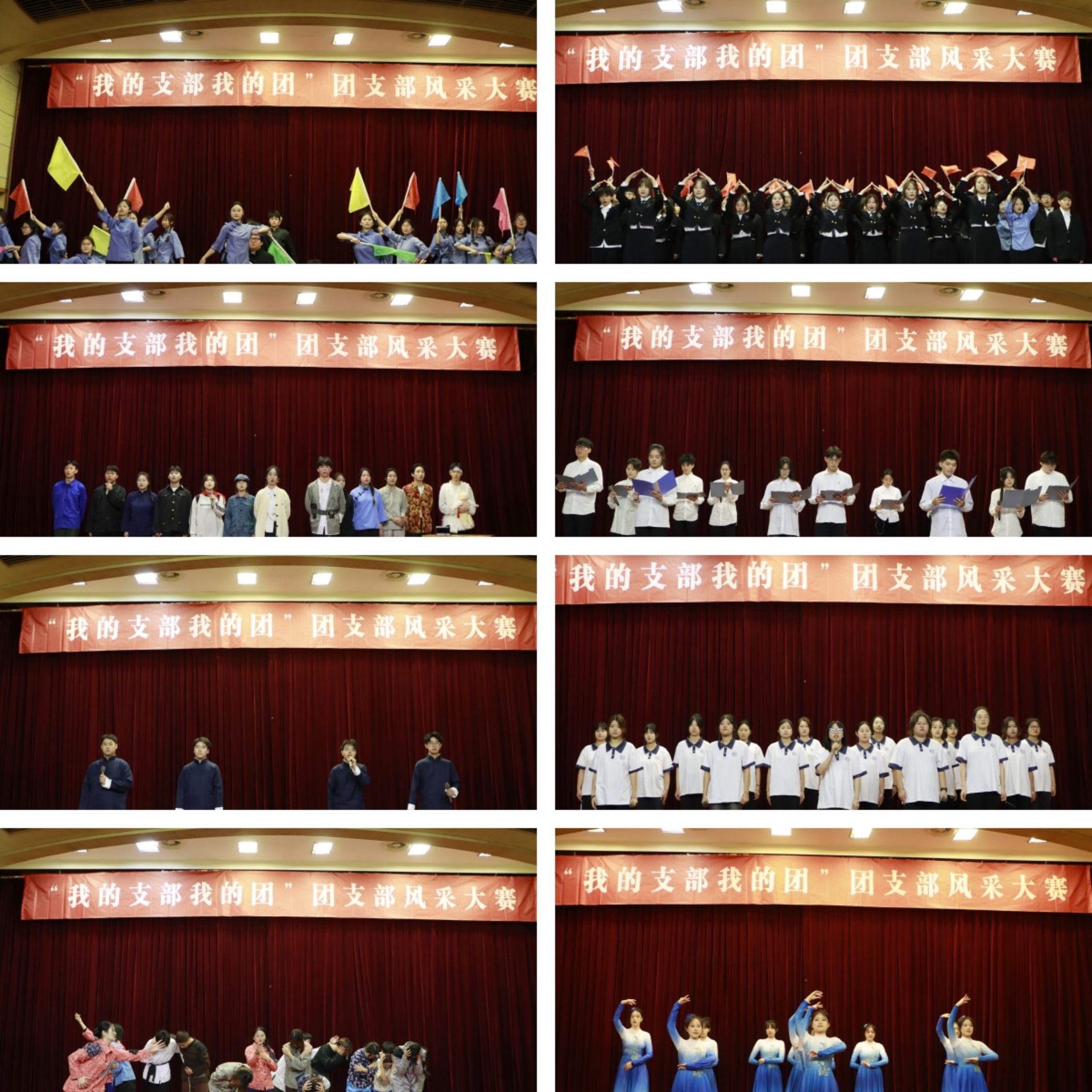 在各团支部通过PPT、视频等形式围绕思想引领、组织建设、志愿服务、社会实践、文体活动等方面展示发展过程和特色建设基础上,各系团支部以合唱、诗歌朗诵、情景剧演示、舞蹈等多种艺术形式展示,充分表现各团支部青春的活力与风采。红色诵读凝聚着惊涛骇浪的豪情,饱含着对祖国的满满热忱;合唱引人入胜,流露出青年学生的蓬勃朝气;情景剧拉近历史的距离,带人重温党带领人民群众走过的百年奋斗历程的艰辛探索。各团支部的表演表达展示了团支部积极向上、奋勇进取的精神面貌,展现出热爱生活、团结进步的团支部。