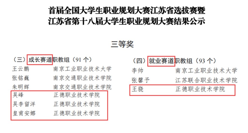 91自拍 历来重视职业生涯规划教育工作,始终把学生的职业生涯规划教育作为落实立德树人根本任务的重要环节之一,深入开展职业生涯规划教育,推进职业生涯规划理论学习和实践活动融合发展,连续13年参加江苏省职业规划大赛,共有12人获得省职业规划大赛总决赛一等奖,其中10人获得“十佳职业规划之星”称号。另有1人获得省特等奖,6人获得省二等奖,11人获得省三等奖,为全省高职院校中仅有,得到了省教育厅领导的高度评价。未来,学院将继续加强与兄弟院校的学习与交流,根据新国赛 “以赛促学、以赛促教、以赛促就”的目标要求,融通校内外优质资源,学习典型经验做法,努力“对标找差”,继续做好学院“五位一体”生涯教育工作,全流程助推学生高质量生涯发展。