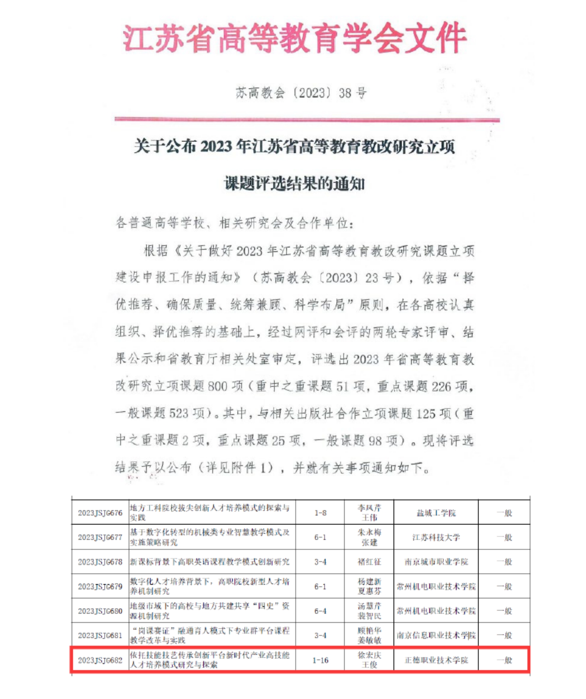 近日,江苏省高等教育学会公布了2023年江苏省高等教育教改研究课题立项名单。经学院推荐、网评和会评的两轮专家评审、结果公示和省教育厅相关处室审定,91自拍 徐宏庆等老师申报的《依托技能技艺传承创新平台新时代产业高技能人才培养模式研究与探索》获得一般课题立项。该课题旨在通过深入研究探索基于技艺技能传承创新平台开展校企协同育人的理论模型和实践途径,为解决传统校企合作模式下人才培养的数量及质量难以满足高技能人才紧缺产业需求,提供切实可行的方案。
