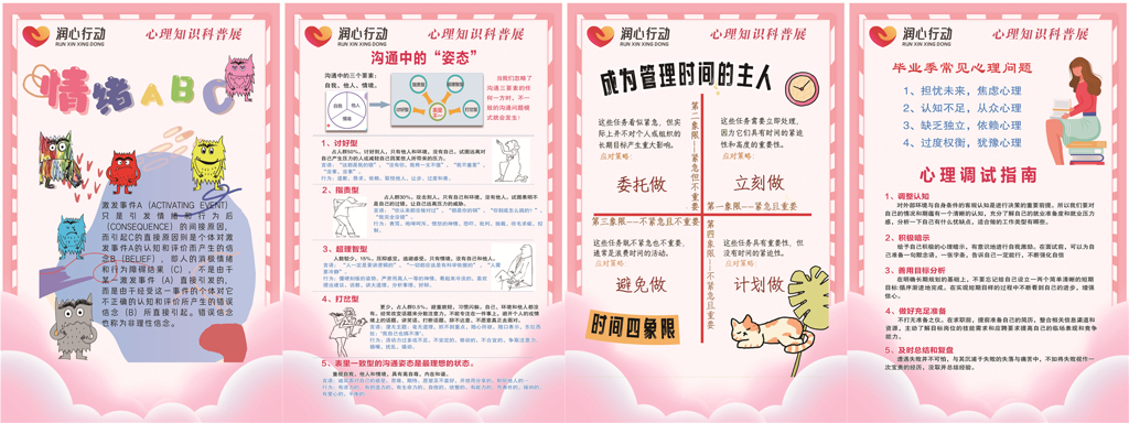 本次科普展活动内容丰富多样,涵盖了人际关系、情绪管理、自我探索、时间管理、沟通技能、失眠应对等与学生生活和学习紧密相关的方面。此次活动始终秉持着“助人自助”的初心,为同学们分享了一系列实用干货,诸如《停止内耗,遇见生活本来的样子》《心理问题的分类与识别要点》《对抑郁症的认识》和《认识自我,打开“周哈里窗”》等实用干货。不仅如此,还十分贴心地为大家呈现了诸多解决生活中“小困扰”的心理技能,包括《get 良好寝室氛围秘诀》《如何与父母相处》《遭遇心理危机,我应该做什么?》以及《心理情绪稳定小妙招》等。更值得一提的是,为了能让同学们更广泛地获取知识,本次知识展还特别提供了多种线上学习通道。
