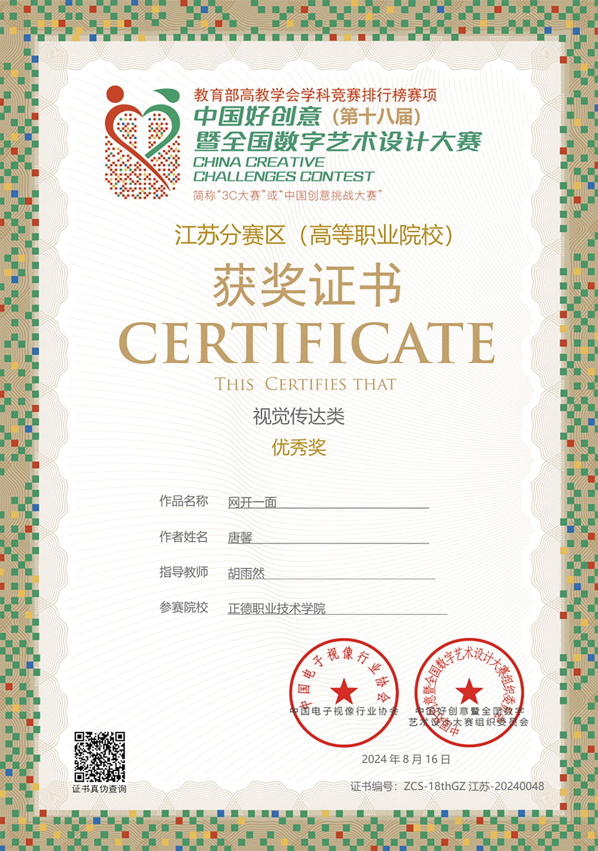 近日,第十八届中国好创意暨全国数字艺术设计大赛落下帷幕。艺术设计与建筑工程系师生荣获国家级一等奖1项、二等奖1项、三等奖2项,省级优秀奖1项,获奖数量创历史新高!胡雨然、王陶两位老师荣获了优秀指导教师奖。这一系列佳绩不仅彰显了我系在数字媒体技术领域的雄厚实力,也为学生和教师们的辛勤付出和才华展现画上了浓墨重彩的一笔。