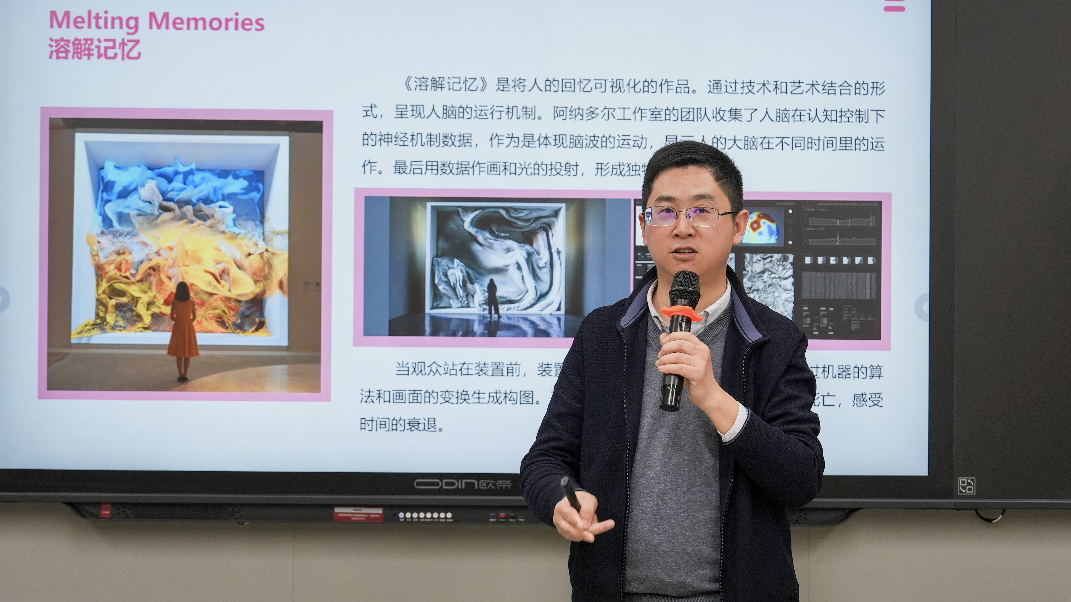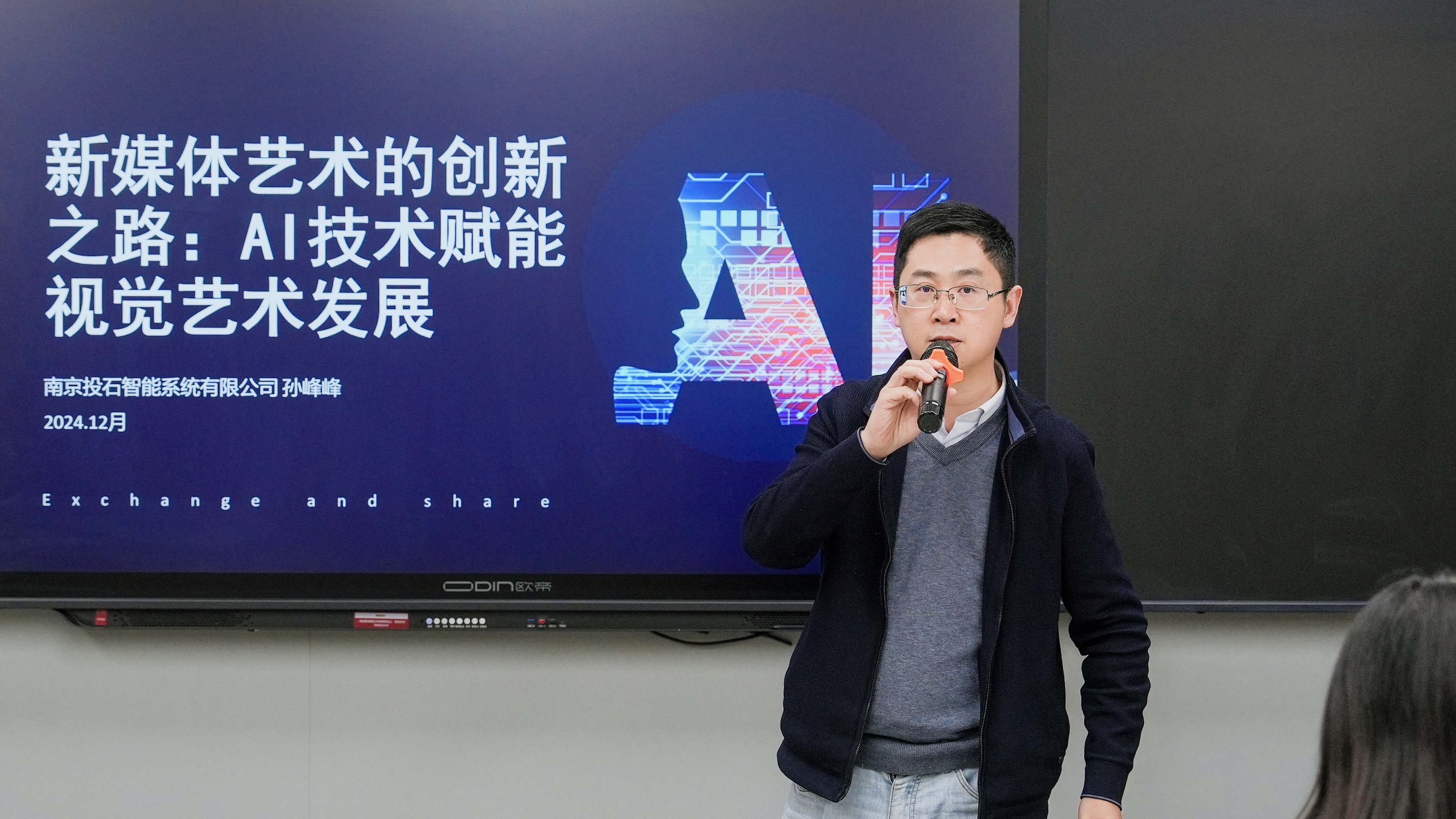 12月5日下午,南京投石智能系统有限公司董事长孙峰峰受邀来到91自拍 艺术设计与建筑工程系,为数字媒体技术专业的师生带来了一场题为《新媒体艺术的创新之路:AI技术赋能视觉艺术发展》的精彩讲座。系主任周卫、副主任陆松及党支部书记杨春娟等领导出席了此次讲座。