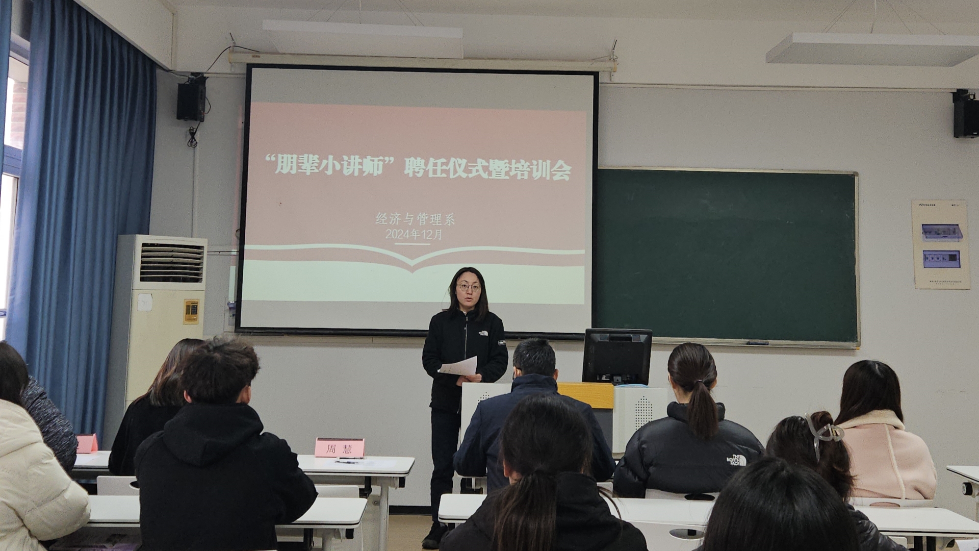 经济与管理系12月13日在7405教室成功举办了一场别开生面的2023级“朋辈小讲师”聘任仪式暨培训会,旨在加强学风建设,提升学生的学习效率与学业水平,营造积极向上的学习氛围。系副主任(主持工作)陶亚宁、系党支部书记、副主任周慧、教师代表、辅导员代表以及2023级竞聘学生共同参加此次会议。活动由系学生会执行主席张书铭主持。