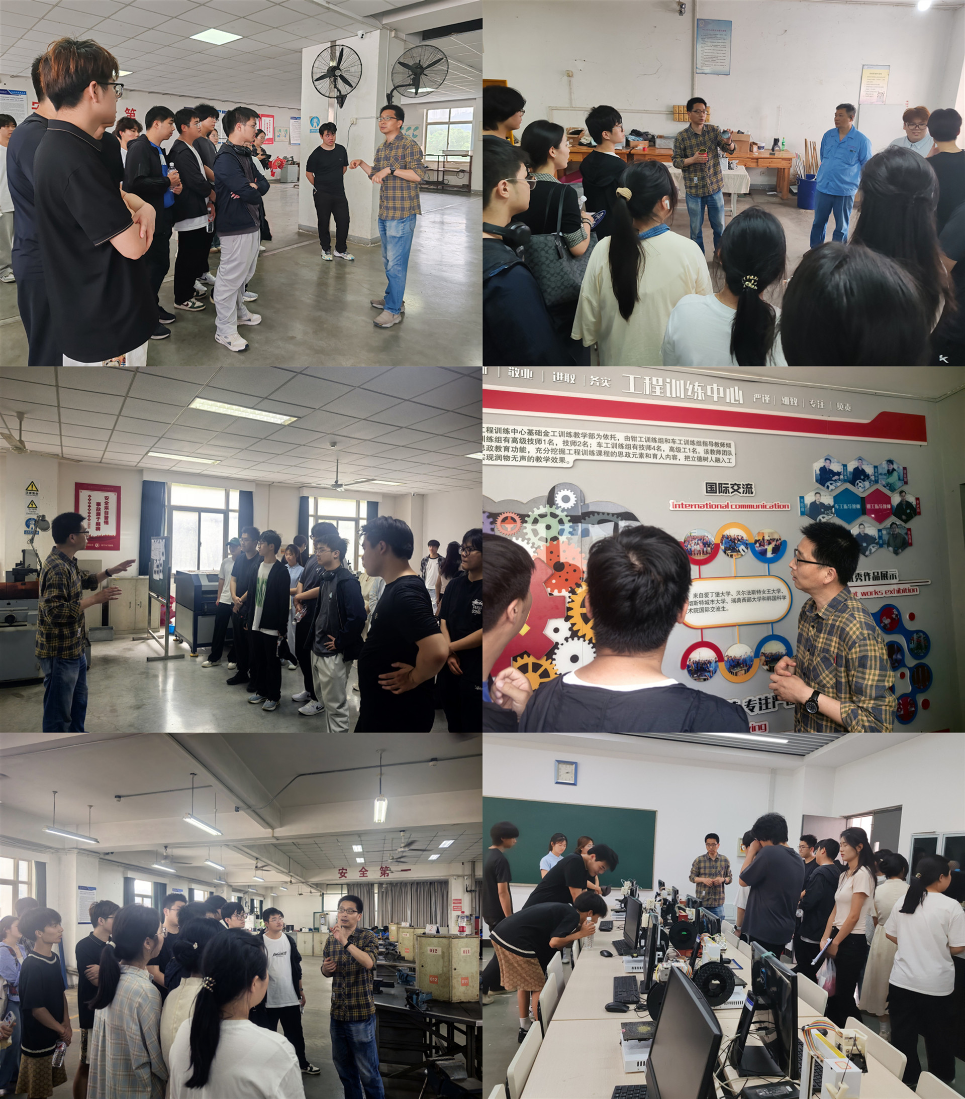 南京航空航天大学公共实验教学部工程训练中心党支部书记刘润、副书记洪颖对电子与信息技术系一行的到来表示热烈欢迎。在刘润的带领下,师生们依次参观了普铣训练区、数控加工训练区、特种加工训练区、工业机器人训练区、3D打印训练区及钳工训练区等多个教学实践区域。每到一处,刘润都结合设备原理、技术应用及教学场景进行深入浅出的讲解,尤其对南京航空航天大学公共实验教学部工程训练中心与新开普电子股份有限公司共建的产学研合作基地进行了重点介绍,展现了“党建引领产学研融合”的创新实践成果。