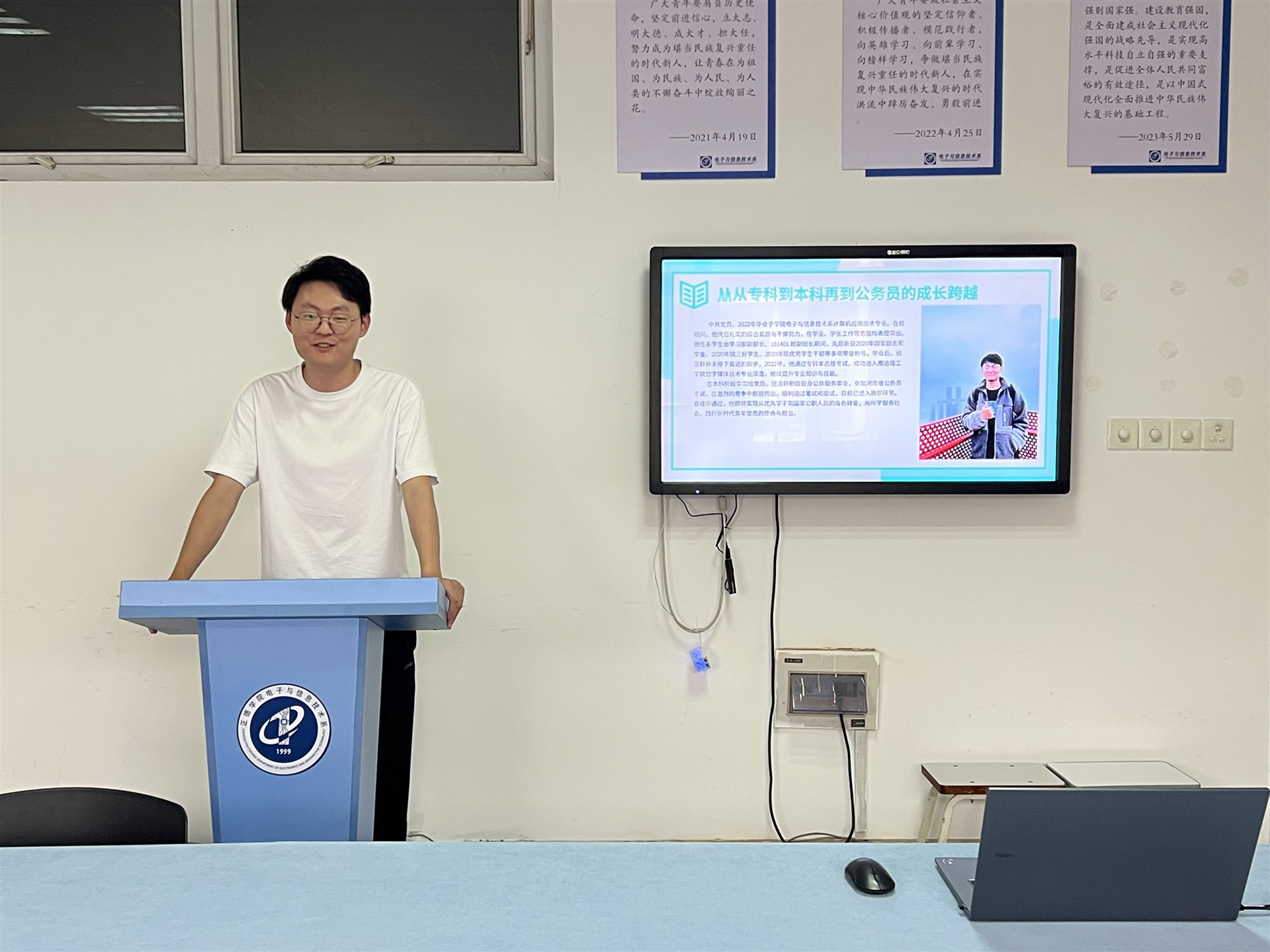 为充分发挥优秀校友的示范引领作用,帮助2024级学生掌握专转本备考策略,明晰职业发展路径,6月11日,电子与信息技术系成功举办“学长来了”专转本备考经验与成长故事分享交流会。本次活动特邀2022届优秀毕业生班浩轩担任主讲嘉宾,电子与信息技术系2024级辅导员刘敏婧、李兰香,班主任孙军辉,2024级学生代表参与活动,会议由孙军辉主持。