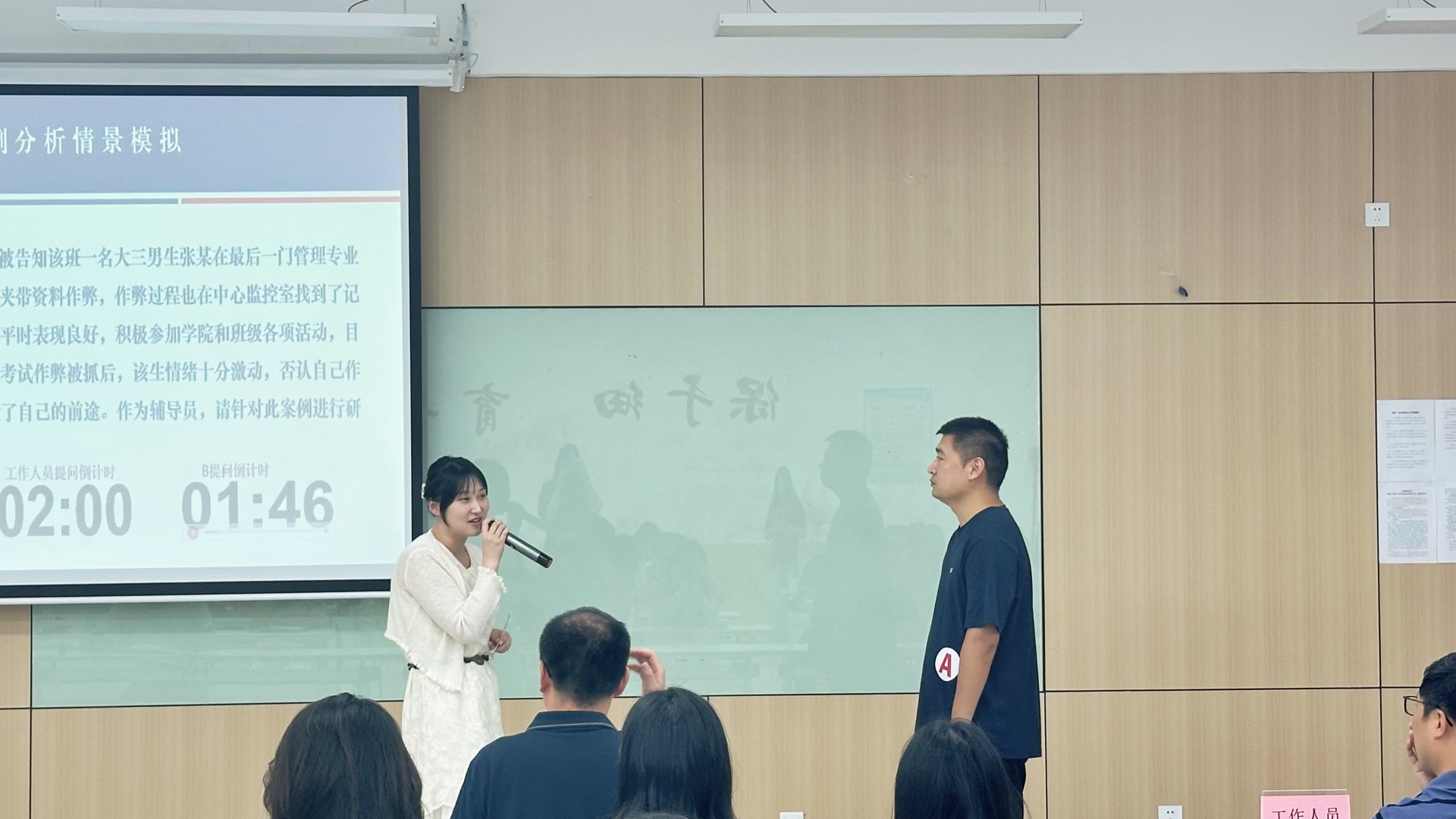 案例分析环节结束后,祝佳俊进行点评并给出解题思路。他指出,首先要对案例进行问题分析,确定属于哪一类工作范畴,坚持解决思想问题与解决实际问题相结合;然后是解决问题,这是最关键的一步,无论一般问题还是突发情况,都要条理清晰地提出具体做法,同时还要确保专业性和实用性相结合;最后就是要学会总结反思,总结经验提出感悟举一反三。
