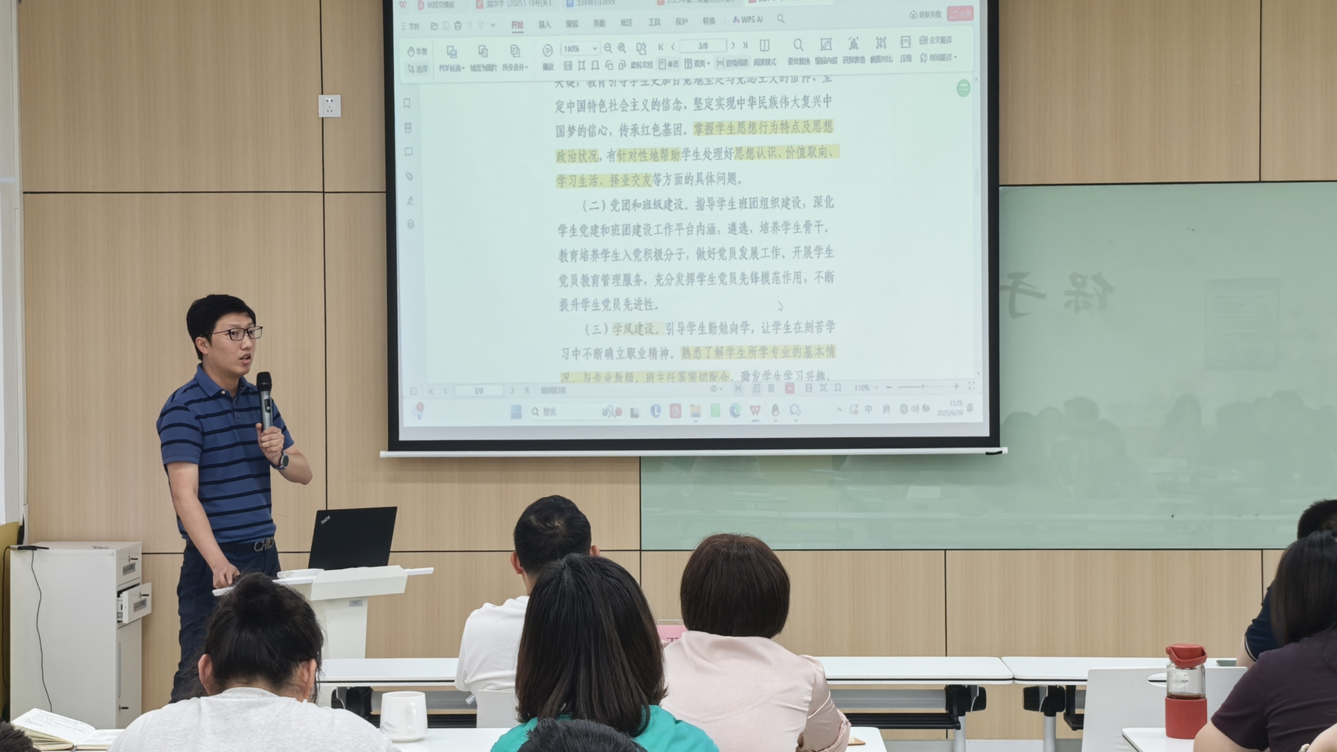 在学习交流环节,祝佳俊对学院新发布的《辅导员工作管理办法(试行)》文件进行详细解读,对辅导员岗位职责和工作内容进一步细化,强调全体辅导员要积极落实立德树人这一根本任务工作,强化思想理论教育和价值引领,要在学生日常事务管理中突出细致入微、公平公正,要秉持以学生为中心的理念,为学生的成长成才提供有力支持,努力为学生全面发展保驾护航,为学院发展注入新的活力,书写学生工作的新篇章。
