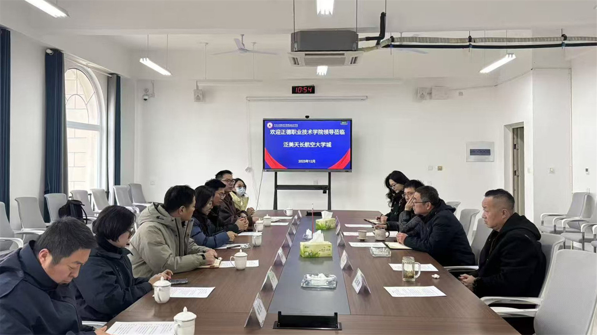 刘佳介绍了学院发展历程及电子与信息技术系的专业布局,并就无人机应用技术专业的建设现状、发展规划作了重点说明。赵欣围绕党建引领、学生管理与育人成效等方面分享了相关经验。双方随后围绕实训基地建设、教学改革与人才培养质量提升等议题展开了深入交流。
