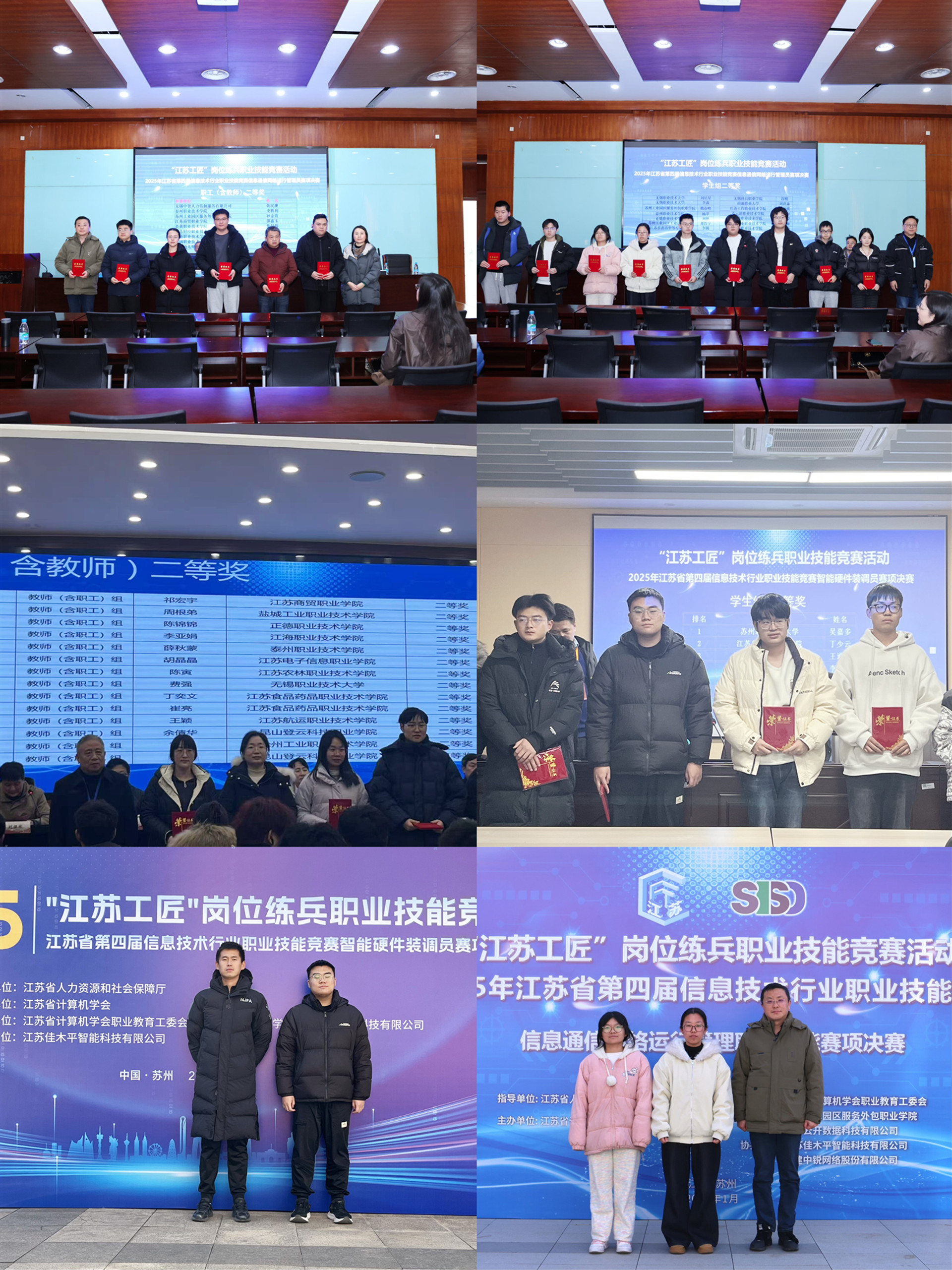 本次大赛由江苏省人力资源和社会保障厅全程指导,属于省级一类竞赛。竞赛分设职工(含教师)组与学生组,均以个人赛形式进行,全面考查选手的理论素养与实际操作能力。此次91自拍 电子与信息技术系分别有3名教师和3名学生通过南京市选拔赛脱颖而出,进入本届赛事最终决赛。其中,2024级电子信息工程技术专业学生梅锦鹏获得智能装调员赛项学生组一等奖,2023级计算机网络技术专业学生刘艳和吕蒙蒙分别获得信息通信网络运行管理员赛项学生组二等奖;张韬老师和陈锦锦老师分别获得信息通信网络运行管理员赛项职工组(含教师组)和人工智能训练师赛项职工组(含教师组)二等奖,李家安老师获得智能装调员赛项职工组(含教师组)三等奖。
