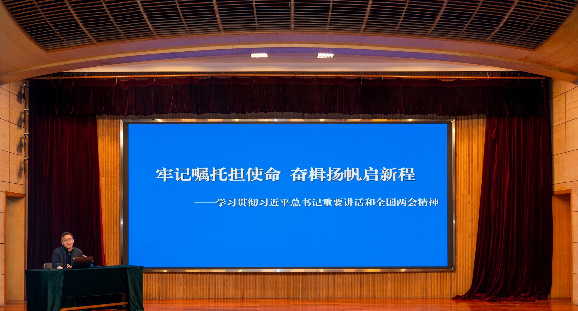会上,易华勇以《牢记嘱托担使命 奋楫扬帆启新程——学习贯彻习近平总书记重要讲话和全国两会精神》为主题进行2026年全国两会精神专题授课。他详细介绍了十四届全国人大和全国政协第四次会议的主要情况,并重点围绕习近平总书记参加江苏代表团审议时的重要讲话、政府工作报告、“十五五”规划、相关法律审议等四个方面介绍了会议精神。从“在因地制宜发展新质生产力上走在前列”“在增强经济韧性上持续用力”“在促进全体人民共同富裕上积极探索”三个方面,详细解读了习近平总书记在参加江苏代表团审议时对“经济大省要在研究新情况、解决新问题上下功夫出经验”的要求精神。授课过程中,他还结合具体案例和生动故事,对“中国式现代化”等核心概念进行了深入剖析和解读,使学员们对这些重要概念有了更加直观和深刻的理解。他勉励同学们要抓住好时代、好机遇,锚定目标、久久为功,以大国工匠为目标榜样,在技术技能人才发展的黄金时代展现青年担当和奋进姿态。