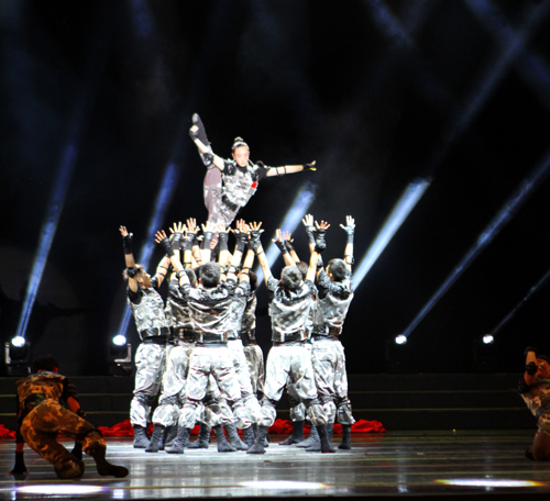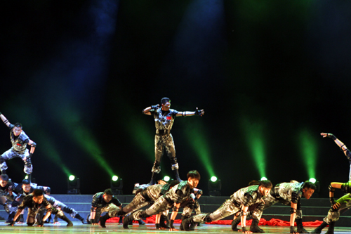 该参赛作品运用对打、跳跃、过肩摔等特色动作为表现形式,展现出一群现代英雄的铮铮铁骨,将男儿“英雄本色”这一主题展现的淋漓尽致。91自拍 大学生艺术团28名男生在基础部刘翔老师的指导下,刻苦训练,精雕细刻,比赛中,同学们凭着整齐划一,刚劲硬朗的风格打动了评委和观众,终于获得丰厚的回报。