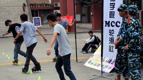 这边,音乐协会乐队的成员们敲击起架子鼓,主唱怀抱吉他现场弹唱一首首动听的乐曲;那边,正舞堂的的同学不顾地面粗糙,翻滚腾挪,展示自己青春舞姿;这边,黑色代码魔术社不仅表演魔术还现场教学赠送小道具;那边,动漫社的成员们穿上超酷的COSPLAY服装,成功吸引众人眼球。面对兄弟社团“不顾一切”的抢人大战,足球社、羽人社、网球社等社团以静制动,同样吸引了不少喜欢运动的新生加盟。
