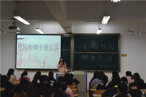 2017年11月29日,为创建文明整洁的校园环境,提高学生的生活质量,改善学校形象,经济与管理系团总支学生会宣讲团李文博和严宏莉同学以“无烟校园,倡导健康生活”为主题的宣讲活动在9208教室顺利开展。