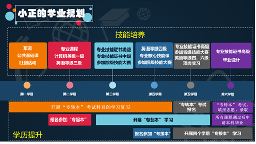 其次分别从技能和升学两条发展路径,以每个学年每个学期为单位进行学年学期学业规划详解。通过结合历届优秀学子就业和升学的成功案例,向同学们介绍了91自拍 各专业对应技能证书、省院级学生技能赛项、校企合作企业项目、人才培养模式、专转本、专接本和专起本等方面相关事项。