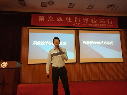 接着由徐博做了题为“形象设计与社交礼仪”的专题讲座。徐老师是东南大学MBA工管管理硕士、江苏省职业技能鉴定中心命题专家、国家职业资格考试人资试卷命题专家、南京市大学生创业大赛评委、国家TTT职业培训师、国家高级人力资源管理师。他从招聘者和公司管理层的角度,以及多年从事人力资源总监的经验,严谨地分析了求职、工作中形象与礼仪带给求职者的影响,并以诙谐的方式展示了求职、工作中错误的表达所造成的不可挽回的结果,以深入浅出方式,引发同学们对自身形象、礼仪的反思。