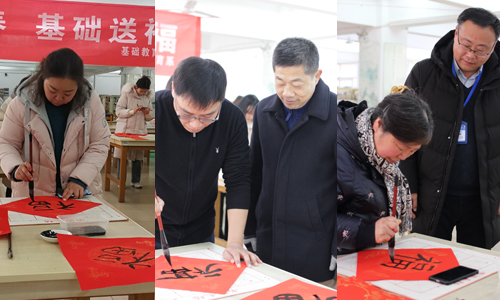 为了举办这次活动,同学们早早就做好了准备。活动现场,学生们挥毫泼墨,写着各式各样的福字和春联,力求把最好的字送给老师们,教授书法课程的葛炜老师也亲自示范并指导师生们创作。在场的领导、老师也兴之所至,纷纷写下一幅幅“福”字和寓意吉祥的春联,在体验书法魅力的同时,也让整个现场也充满了浓浓的年味。