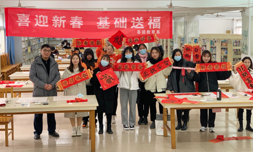 2021年1月6日中午,图书馆二楼阅览室洋溢着一片热烈的新年气氛,基础教育系的老师和同学们在这里举办“喜迎新春,基础送福”活动。该系的大二同学们在葛炜老师的带领下,现场写福字赠送给老师,表达对老师们悉心教导的感谢,同时也展示该系幼儿发展与健康管理专业书法学习的成果。
