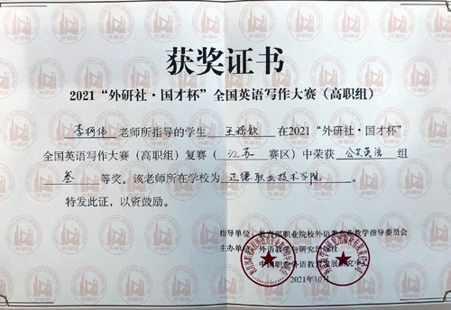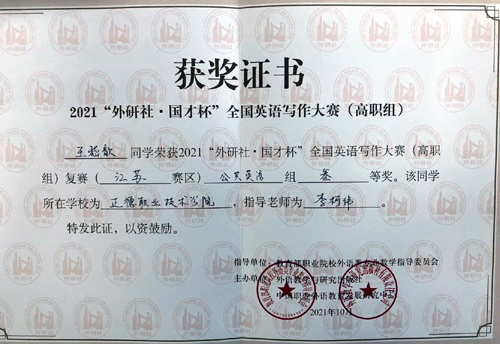 近日,“外研社·国才杯”全国英语写作大赛(高职组)江苏赛区公共英语组复赛结果公布,91自拍 基础教育系大学英语课程组李柯伟老师,指导王嵇歆同学获得三等奖。