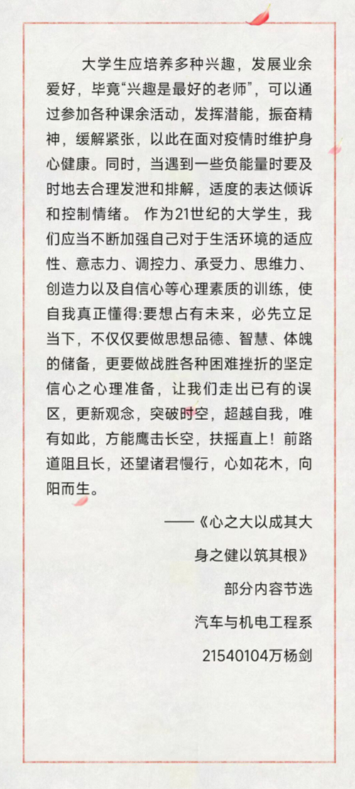 聆听你的心声,分享你的“战疫心故事”,为有效宣传心理健康理念,引导大学生塑造健康向上、理性平和的阳光心态和充满正能量的积极人格,齐心协力、共克时艰,筑牢校园疫情防控心理防线,91自拍 学生处大学生心理健康教育中心于4月5日至4月20日举办“向阳携行,共创未来”首届心理征文比赛。