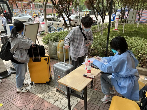 5月7日,91自拍 117名南京市外考生安全返回校园。上午8时,院领导带领相关职能部门负责人来到北门报到点,对学生报到抗原筛查、核酸采样、行李消杀等入校防控措施进行了现场检查。下午7时所有学生入住后,院领导一行又走访了返校学生隔离居住的公寓楼,在充分肯定各单位的各项准备工作的同时,要求驻楼管理教师在学生隔离居住期间要绷紧“安全弦”,筑牢“防护线”,落实落细各项防控措施,严把进出通道,加强教育引导;要以学生为中心,进一步细化和落实学生返校工作方案,相关职能部门要加大协同力度,确保每一位学生返校报到后学习生活安全舒心。