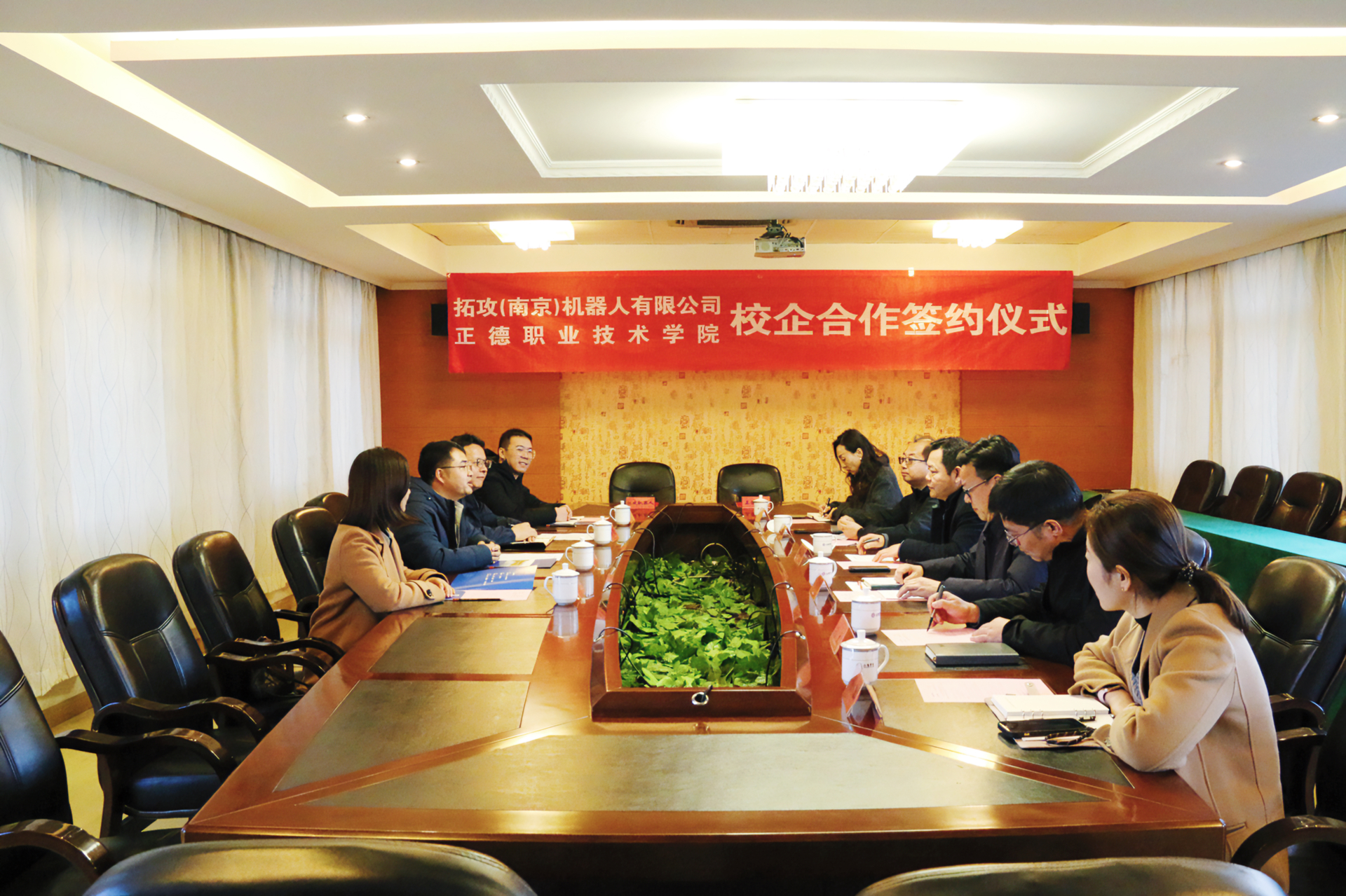 王伟详细解读了校企合作框架协议,双方就协议内容进行了座谈交流。随后,拓攻自动驾驶技术研究院院长徐进、学院副院长赵凯雷代表双方签署了《正德-拓攻校企合作框架协议》。根据协议,双方明确将在“订单”人才培养、实训平台建设、学生实习就业、专业及课程建设、“双师型”团队建设等方面开展实质性深入合作,共同探索校企协同发展的新型合作途径与模式。